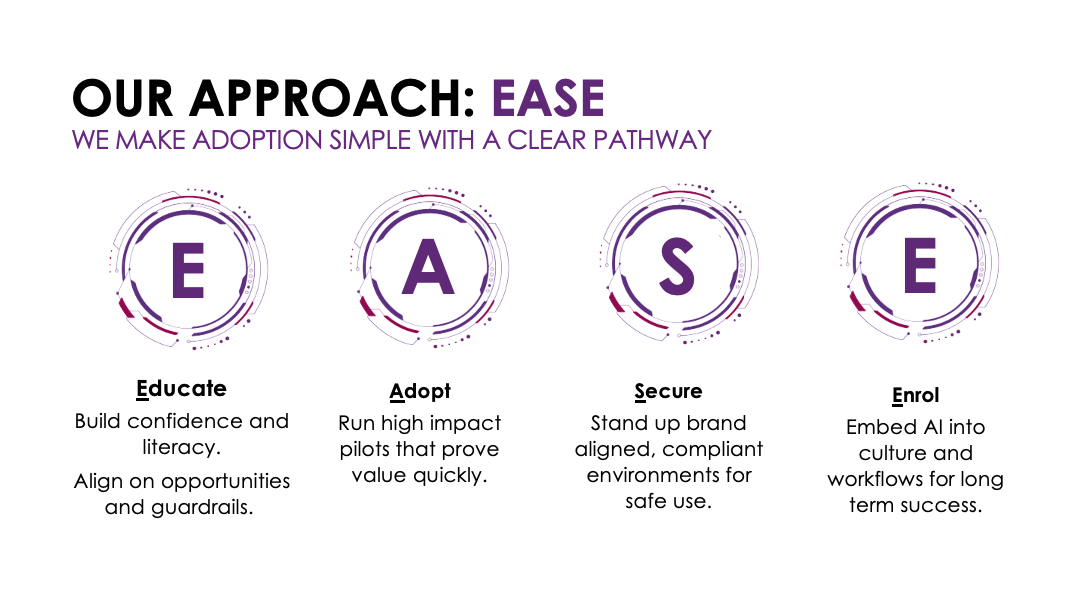 In a landscape where AI adoption is still new and uncertain, the EASE framework provides clarity and direction. It helps organisations learn responsibly, prove value safely, and scale confidently – ensuring that AI isn’t just adopted, but adopted well.